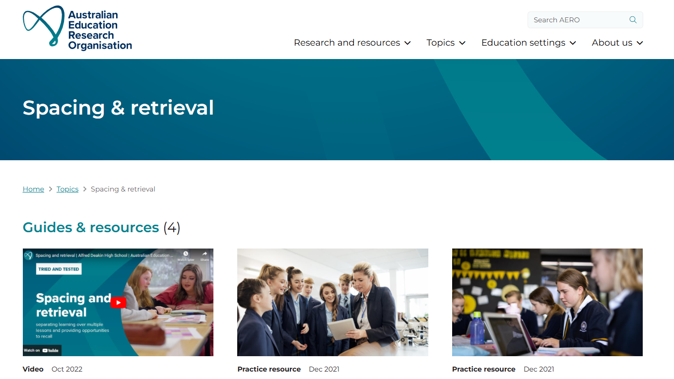 Australian Education Research Organization (AERO) הוא הארגון האוסטרלי להוראה מבוססת עדויות ממחקר, גם פה יש מאגר גדול ונוח - מעובד ומונגש למטרות הוראה. ניתן לחפש בקלות אסטרטגיות ממגוון תחומים (הוראה מפורשת, ניהול כיתה, הערכה מעצבת ועוד..) וגם לפי תחומי הוראה. חלק מהתכנים מגיעים היישר מכיתות הלימוד, לדוגמה מקורות בנושא תרגול מועיל המתבסס על שליפה מהזיכרון וריווח בזמן: