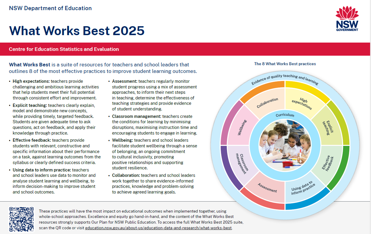 מקור משמעותי נוסף מאוסטרליה מגיע מהאתר הממשלתי של מדינת ניו סאות' ווילס - אוסף מקורות מעובדים מבוססי מחקר, מעודכן ל-2025 שמתמקד ב-8 נושאים: ציפיות גבוהות, הוראה ישירה/מפורשת, משוב אפקטיבי, יישום מבוסס נתונים, הערכה, ניהול כיתה, שלומות ושיתוף פעולה בהנעת שינוי ברמת בית הספר. המקורות כוללים סיכום עדויות מחקר, מדריכי יישום ודוגמאות מהשטח (הכל ניתן להורדה, ע"פ החלק המעניין).